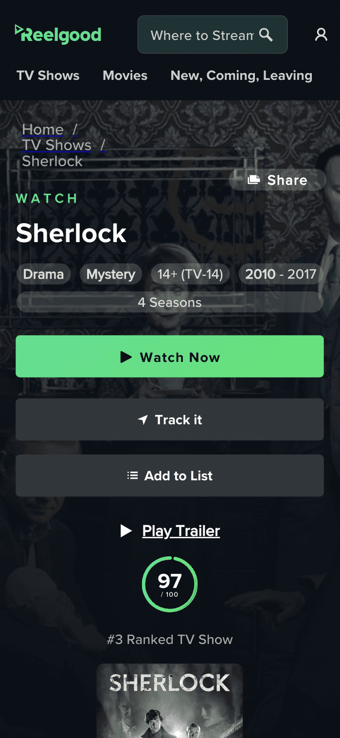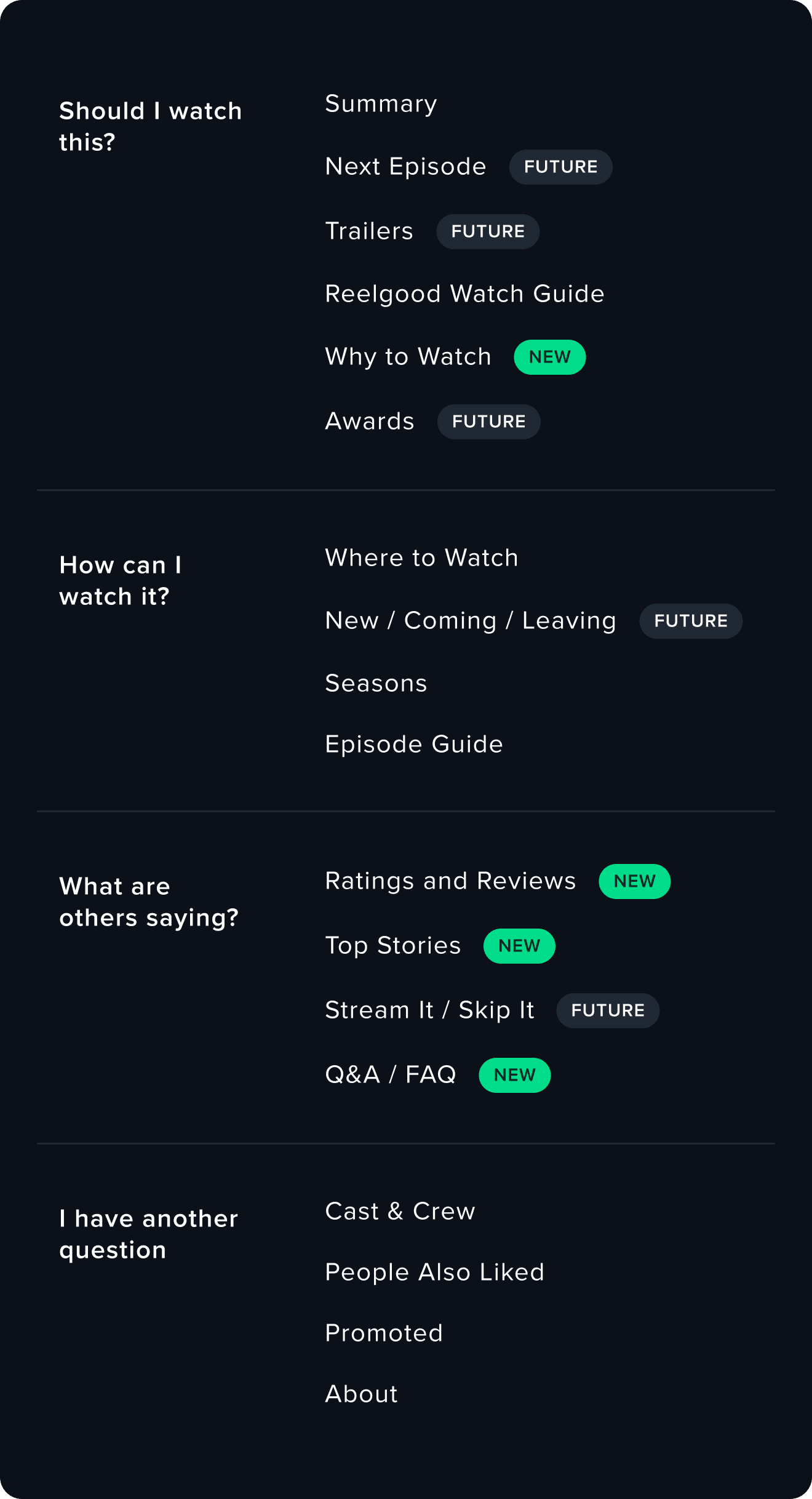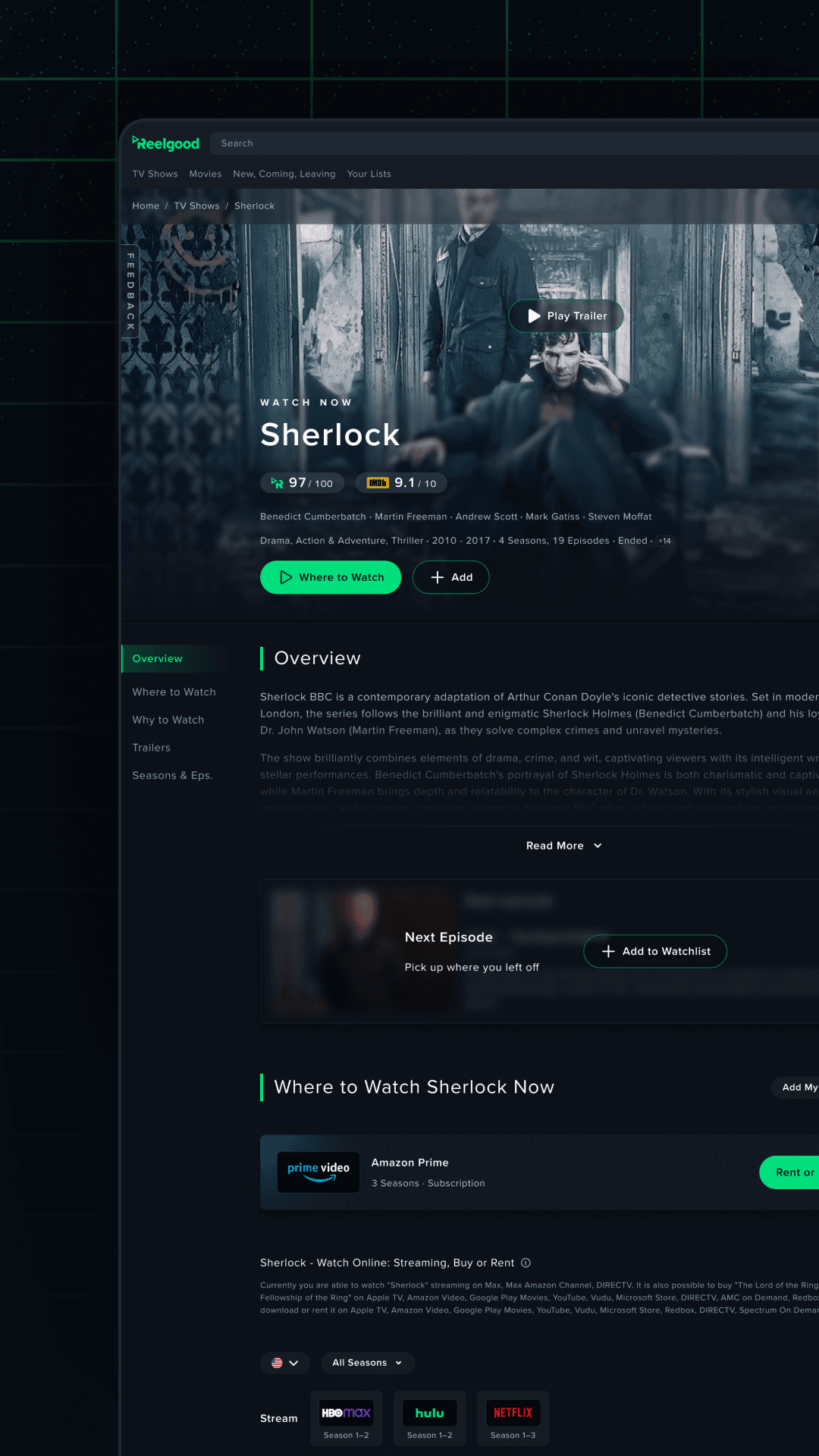 Reelgood's core B2C offering revolves around the title detail pages of its web appโmovie, show, season, and episode pages serving as content hubs. These pages, totaling hundreds of millions, drive most of the site's traffic through long tail search queries like "Where can I watch X?" acting as the primary touchpoint for user acquisition and conversion.