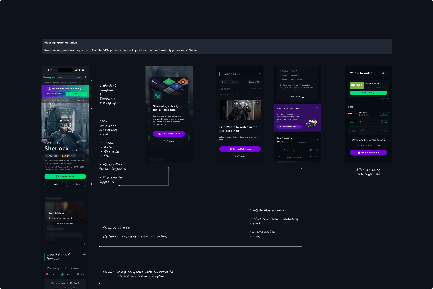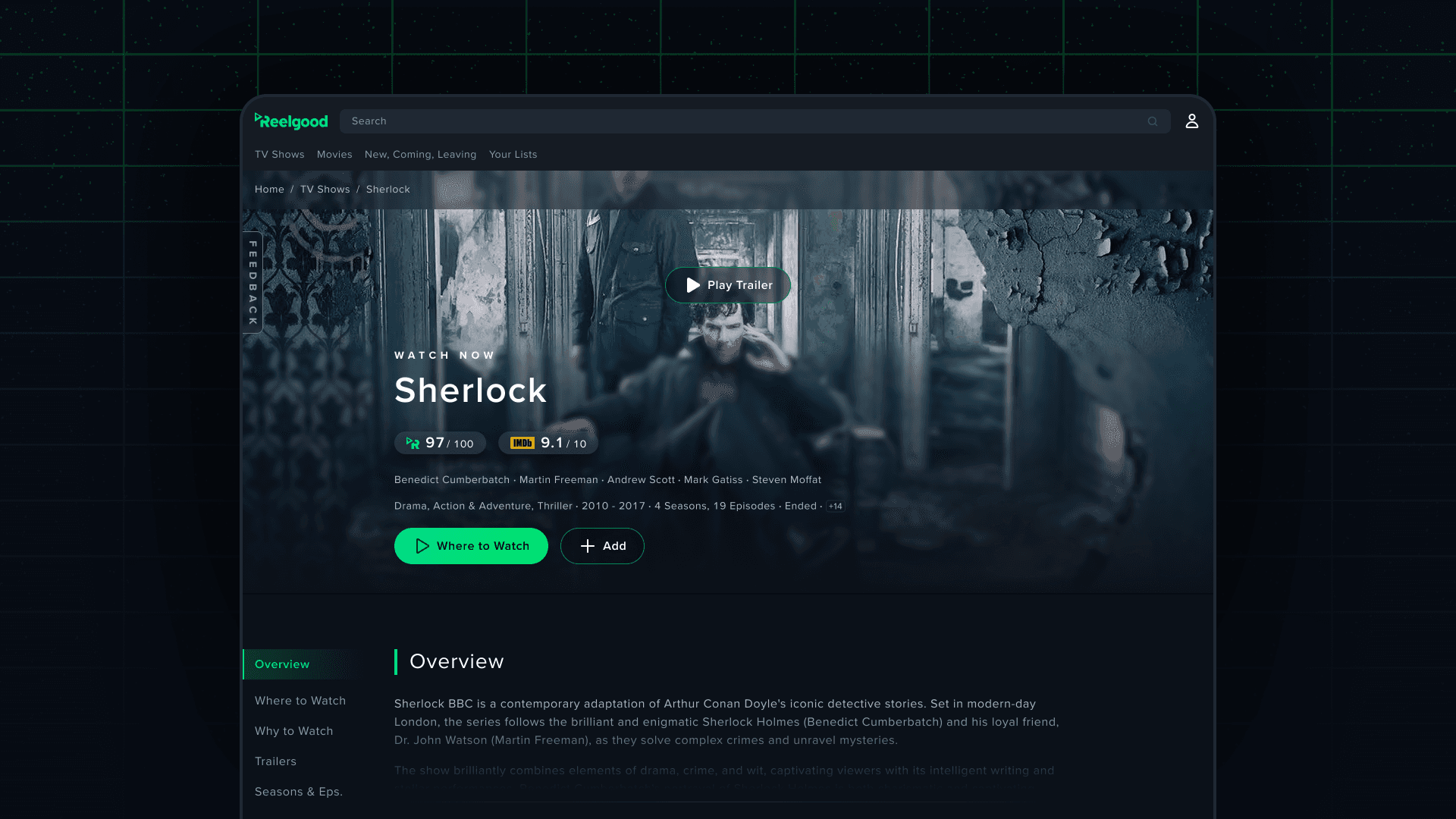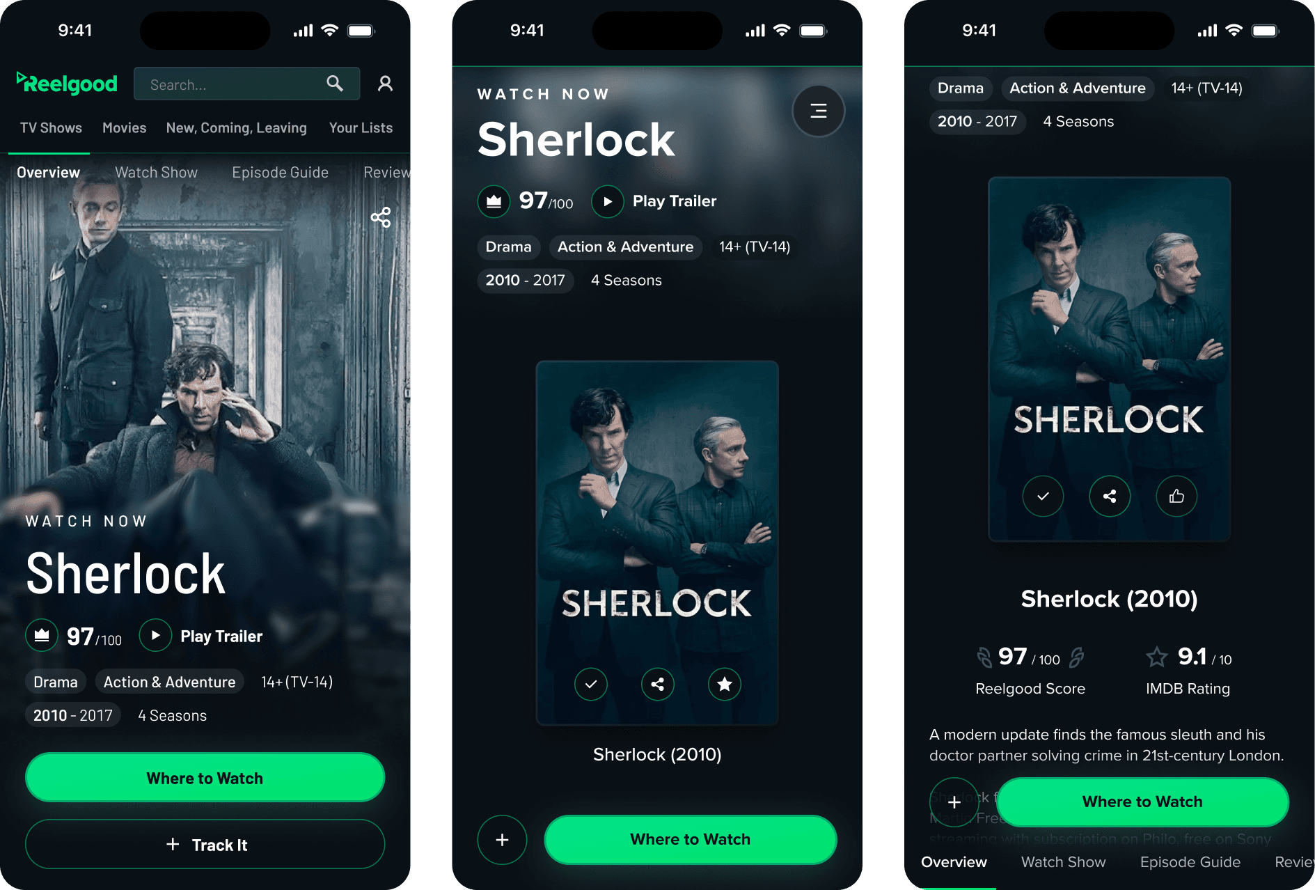 Reelgood's core B2C offering revolves around the title detail pages of its web appโmovie, show, season, and episode pages serving as content hubs. These pages, totaling hundreds of millions, drive most of the site's traffic through long tail search queries like "Where can I watch X?" acting as the primary touchpoint for user acquisition and conversion.
